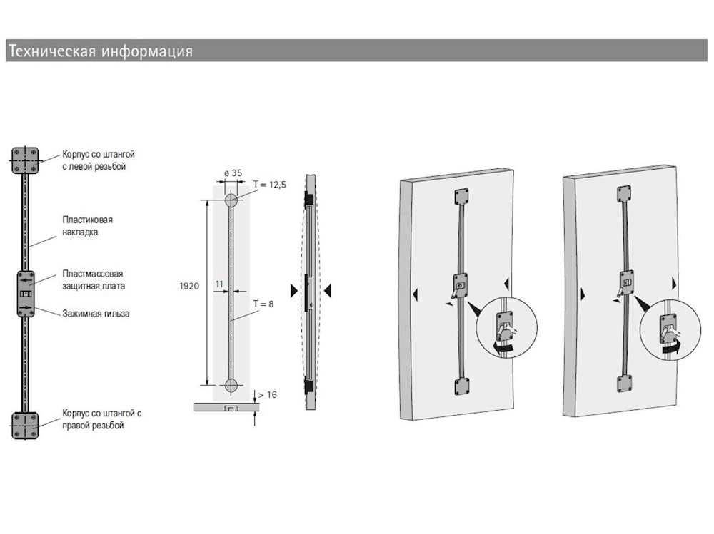 Комплект стяжек-выпрямителей для дверей от компании Hettich предназначен для выравнивания и предотвращения деформации дверей толщиной от 16 мм и высотой до 2600 мм. Этот набор идеально подходит для поддержания ровной поверхности фасадов шкафов и других крупногабаритных изделий, обеспечивая их надежную эксплуатацию на протяжении длительного времени. Установка стяжек осуществляется путем вкручивания двух штанг с правой и левой резьбой в гильзу с внутренней резьбой. Каждая штанга фиксируется корпусом в отверстии диаметром 35 мм.