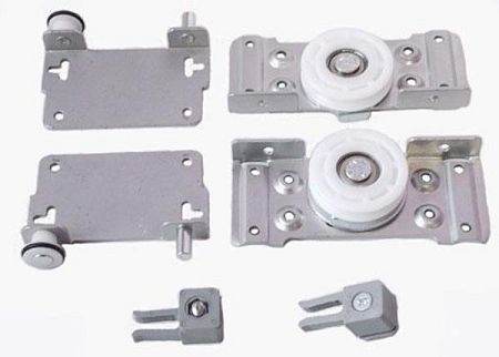 Система с нижним несущим механизмом для дверей весом до 80 кг. Комплект на одну дверь включает два нижних ролика на подшипниках с полиамидным покрытием, два верхних направляющих ролика с полиамидным покрытием и два верхних стопора. В данном комплекте уже в наличии комплектующие на 2 двери.