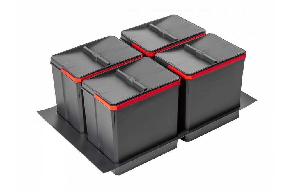 Комплект ведер AxiSpace для модуля 900 мм (4x15L) антрацит - набор вместительных емкостей для бытовых отходов, предназначенный для установки в ящик 900 мм выдвижной системы Axis Pro, Modern Box Pro, Modern Box. Ведра AxiSpace являются первым продуктом такого типа на рынке, который сделан из материала, содержащей графеновые частицы с бактерицидными свойствами. Графен - это наноматериал изготовленный из углерода с антибактериальным и противогрибковым эффектом. Он удаляет со своей поверхности до 99% микроорганизмов в течение 120 минут. Комплект позволяет сортировать мусор в соответствии с современной практикой утилизации отходов.